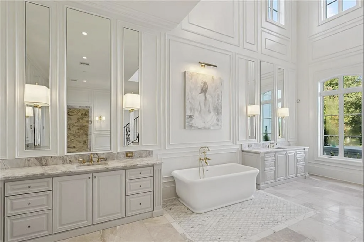 A palette of layered whites and warm taupes sets a serene tone, enhanced by marble tile, marble countertops, and finely detailed brass plumbing fixtures. At the heart of the space, a sculptural freestanding tub anchors the room beneath thoughtfully placed artwork, a focal point that balances drama and calm in this tailored, light-filled retreat.