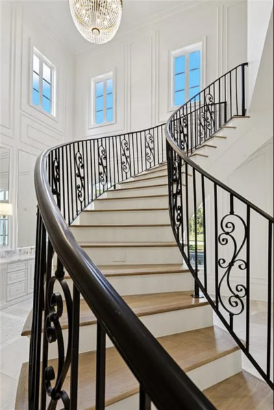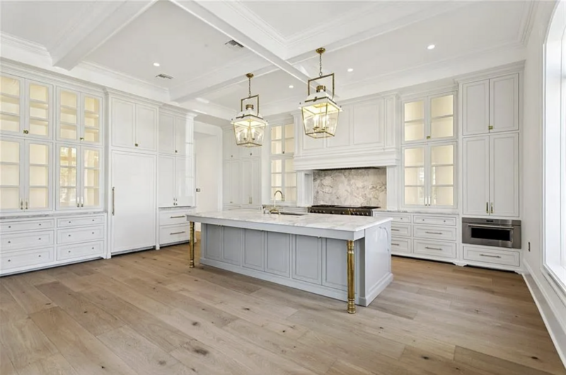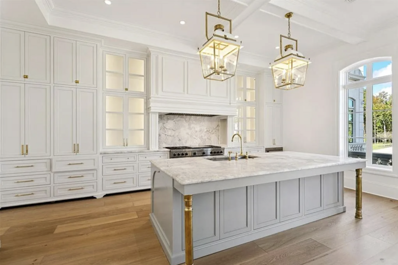 For the kitchen, I selected finishes that keep the open space bright and timeless while carrying subtle French Country influences into a modern setting. The light blue grey cabinetry adds a gentle wash of color that pairs well with the brass details, and the marble countertops tie the palette back to the soft, natural elegance used throughout the home. The homeowners chose the light fixture early in the process, and I used its character as the guiding note for the overall feel of the space.